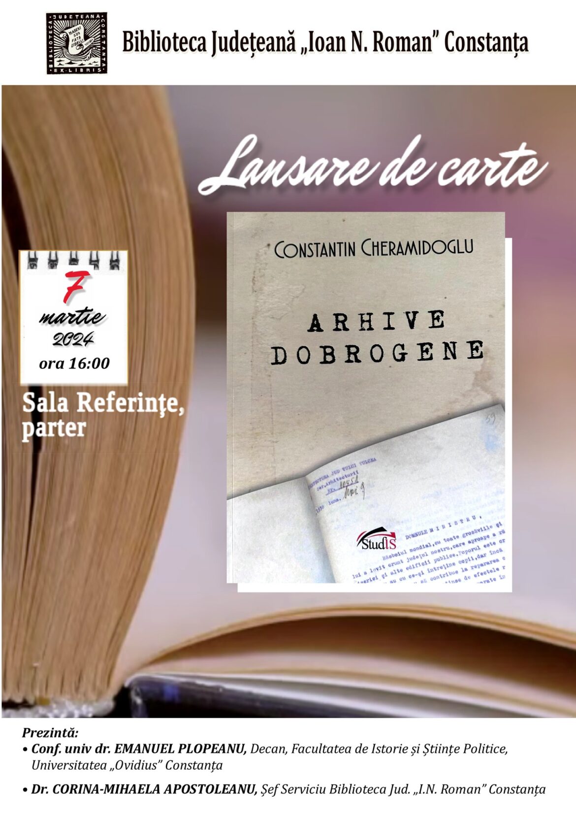 Joi, 7 martie 2024, de la ora 16:00, Biblioteca Județeană „Ioan N. Roman” Constanța va găzdui lansarea unui nou volum semnat de dr. Constantin Cheramidoglu, intitulat „Arhive dobrogene”.